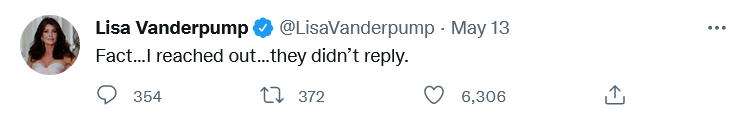 Done with it she was. Instead of fulfilling her contractual obligation and finishing out the season, Lisa left halfway through filming and skipped the reunion taping altogether. Three seasons later, and LVP's militant fans continue to blame Dorit (and the entire cast) for "piling on" Lisa and driving her off the show. As of this writing, neither Dorit or P.K. have responded to LVP's tweet. It turns out that the Kemsleys (as well as the entire cast) are done with HER.